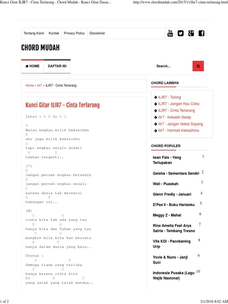 Chords la del lunar ver. Video musik dari ilir7 berjudul 'cinta terlarang'.untuk mendengarkan lagu dari artis dan musisi ascada musik lainnya, klik di sini: Fret 2 g daku kekasimu pujaan hatimu em dtapi tak pernah kau hargai aku c gmalah kau sakiti aku a dkau permainkan perasaanku.(*) g dcinta yang kau beri tak sepenuh hati em dhingga ku rasa kau tak disini c gsayang coba kau ratapi a dsakitnya hati kau buat begini. Berikut kumpulan chord ilir7 yang bisa sobat mainkan dengan gitar. More images for chord kekasih gelap ilir7 cinta terlarang »